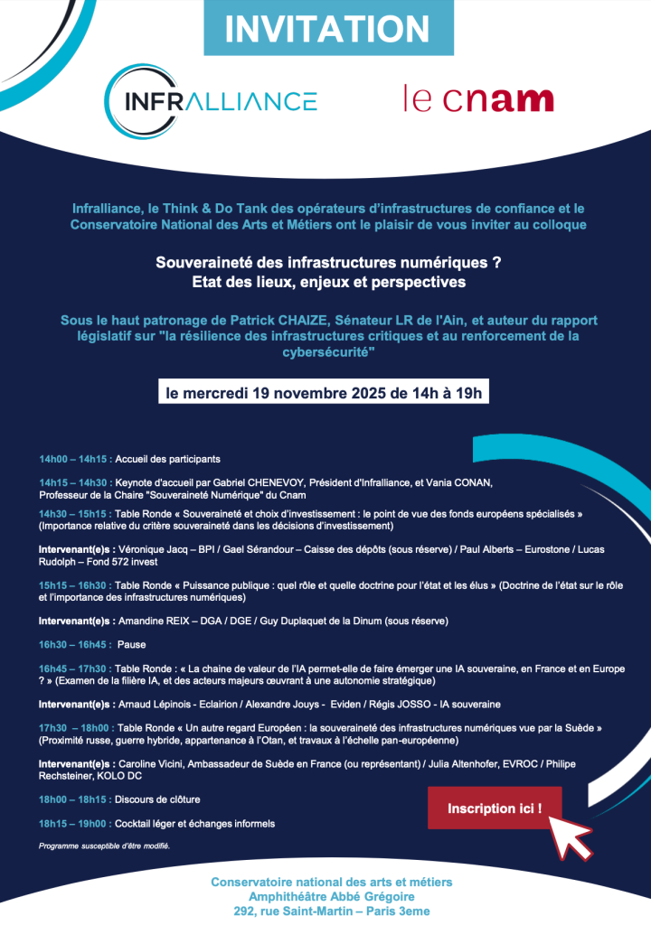 Organisateurs : la Chaire “Souveraineté Numérique” du Cnam et Infralliance, think et do tank des opérateurs des infrastructures de confiance